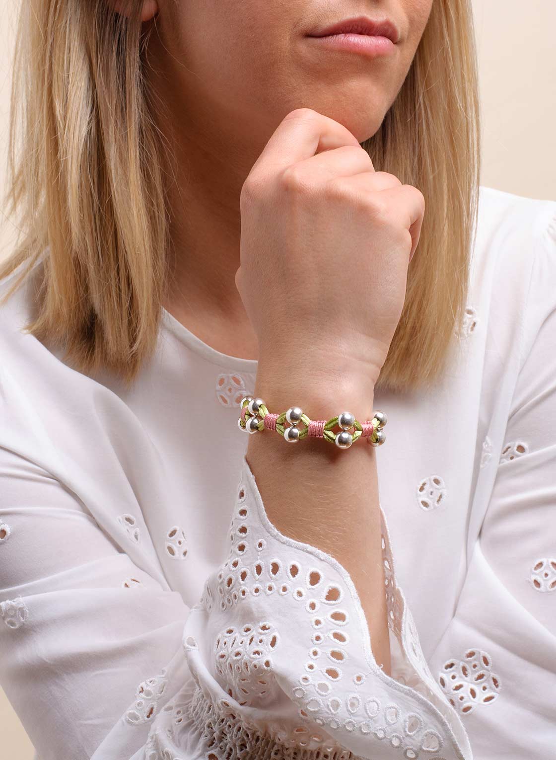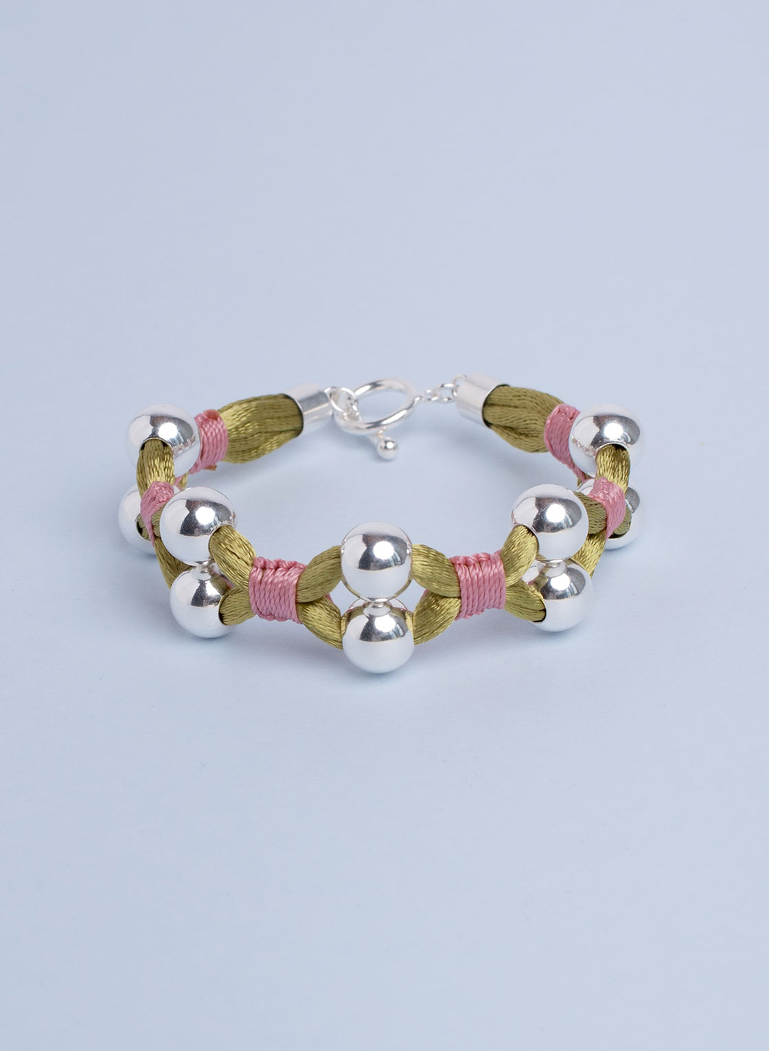 Raffiniertes Statement Armband in Sterling Silber, Satinband und Makramee. Die hochwertigen Silberkugeln und das glänzende Satinband geben dem Armband eine raffinierte Eleganz, während die Makramee-Technik ihm einen Hauch von Boho-Chic verleiht.