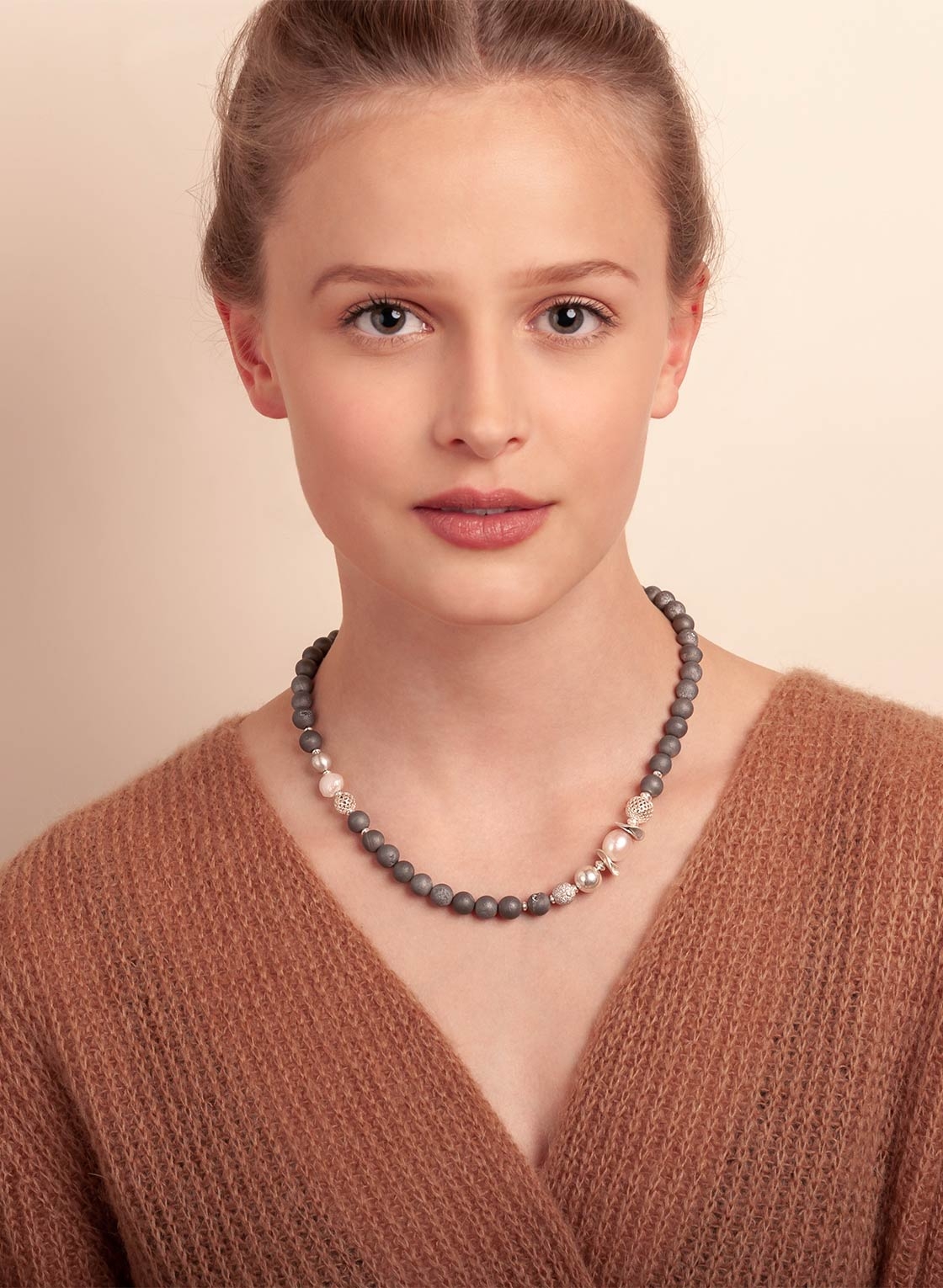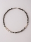Kette aus grauen, schimmernden Achatkugeln mit glänzenden Einschlüssen, kombiniert mit Süßwasserperlen und verschiedenen Silberelementen.