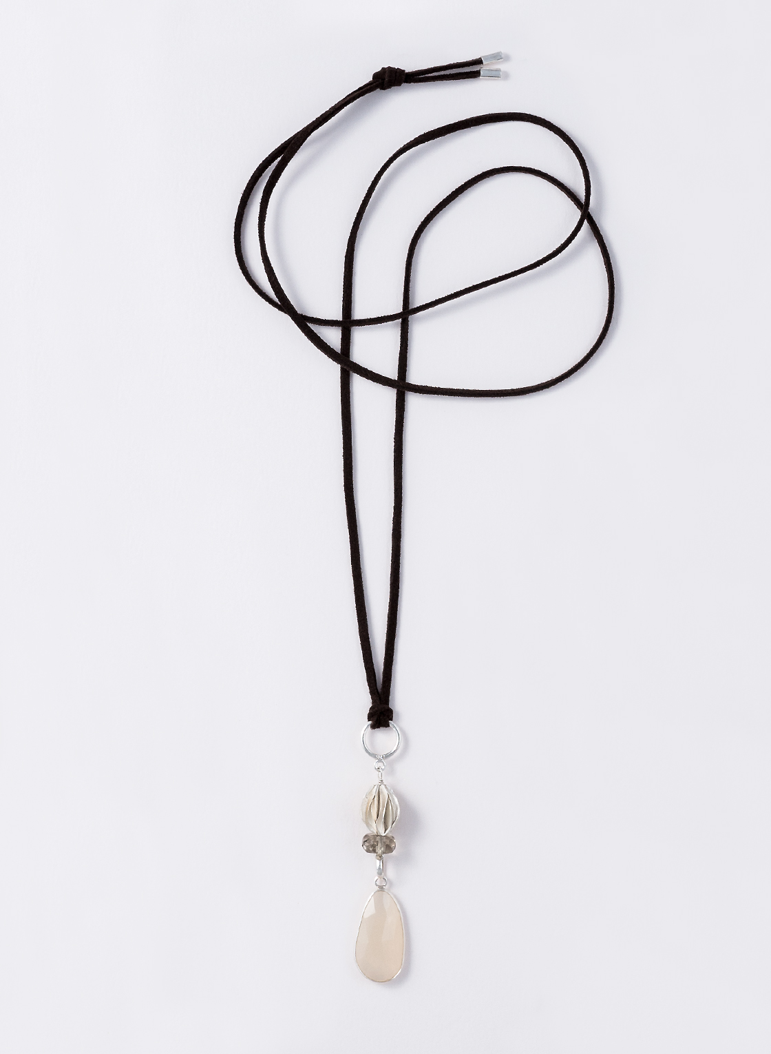 Edler Boho Anhänger mit großem Mondstein, facettiertem Rauchquarz und Elementen in 925 Sterling Silber. Kombiniert mit einem Kunstlederband.