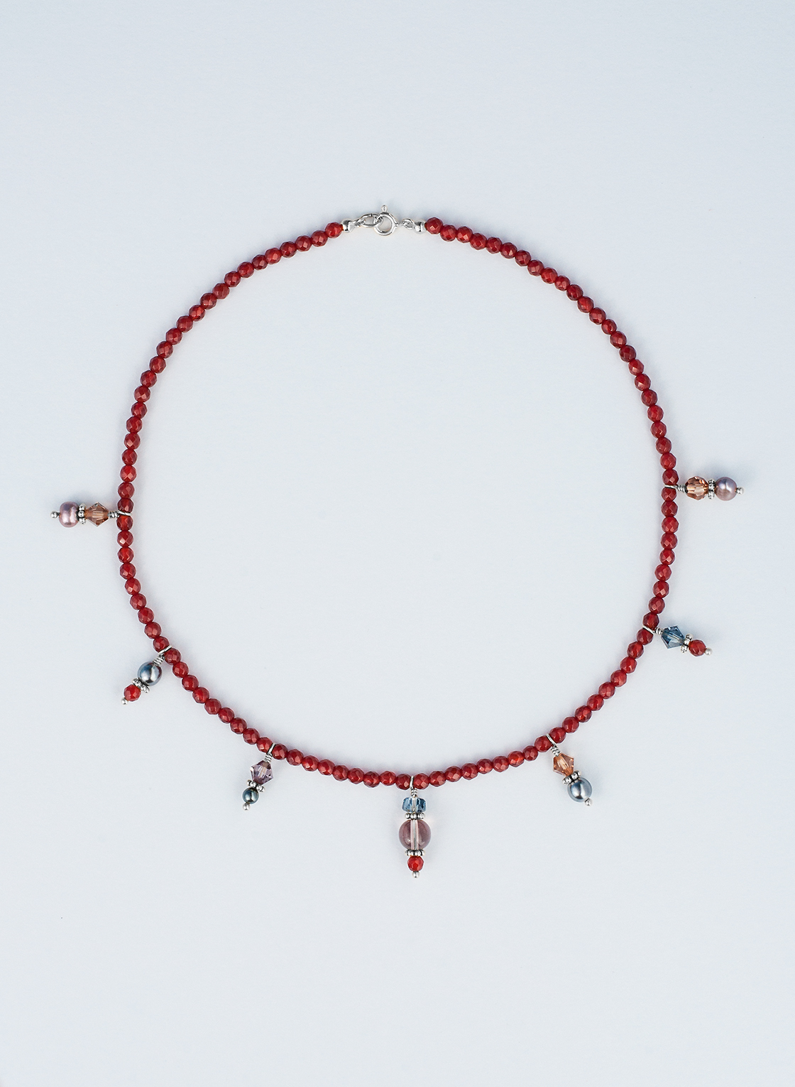 Kette in facettiertem, roten Karneol mit verschiedenen Anhängern aus Süßwasserperlen, Kristallen und Blümchen.