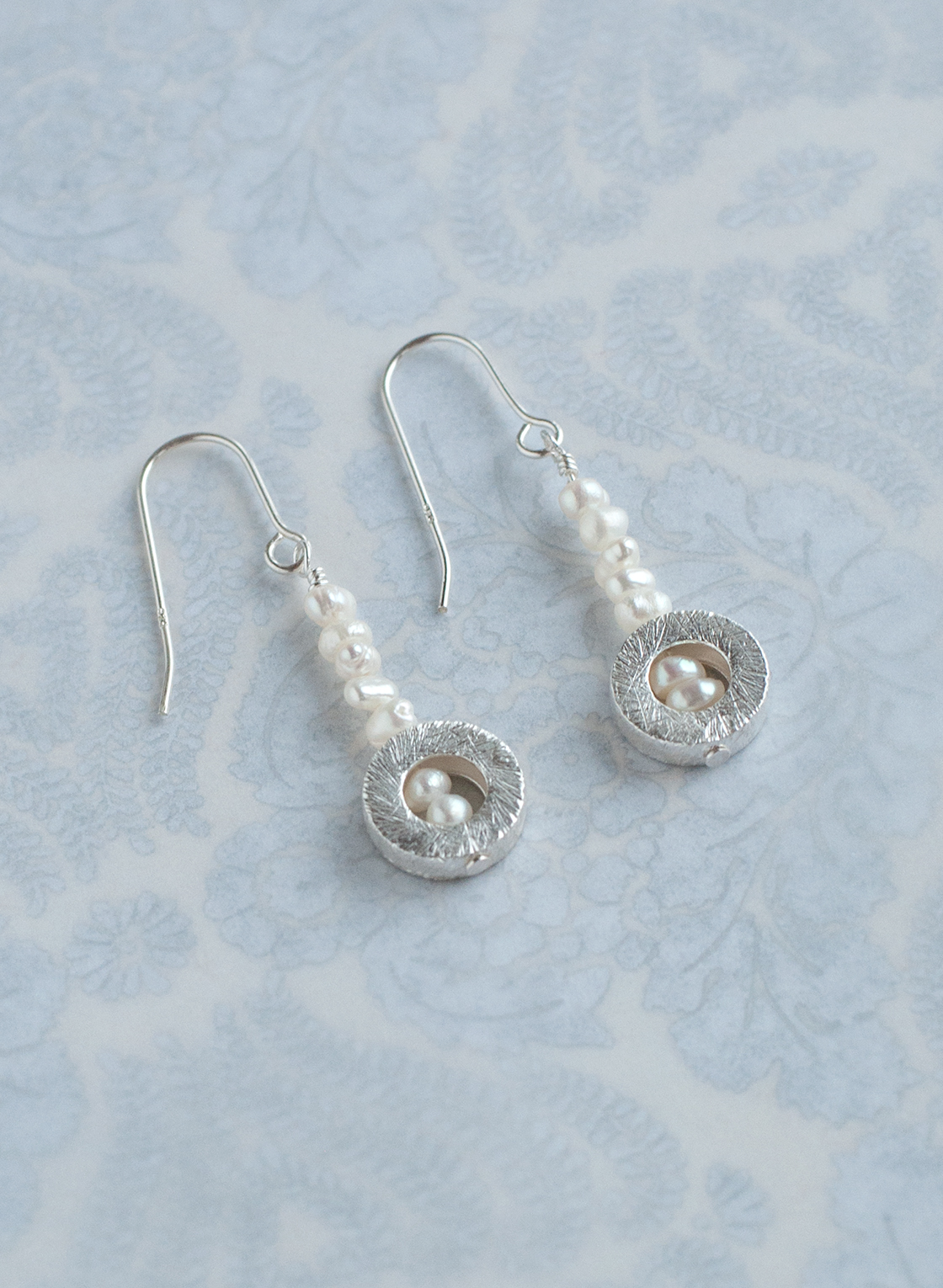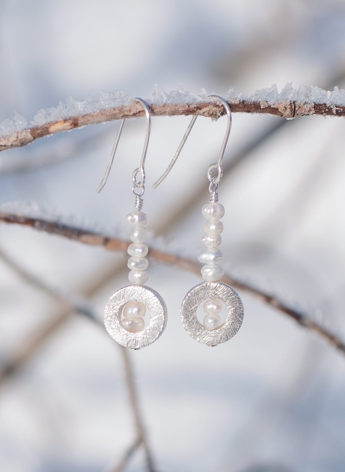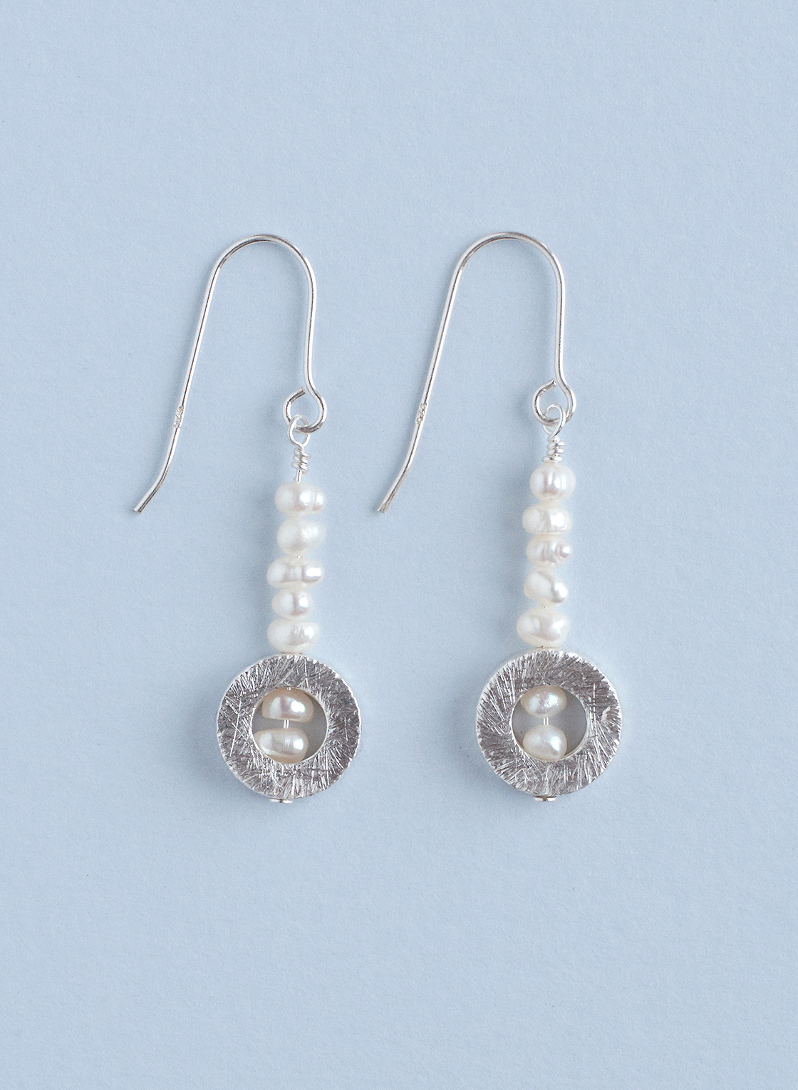 Bei diesen schönen Ohrhängen im elegantes Design verzieren feine Süßwasserperlen ein matt silbernes Kreiselement.