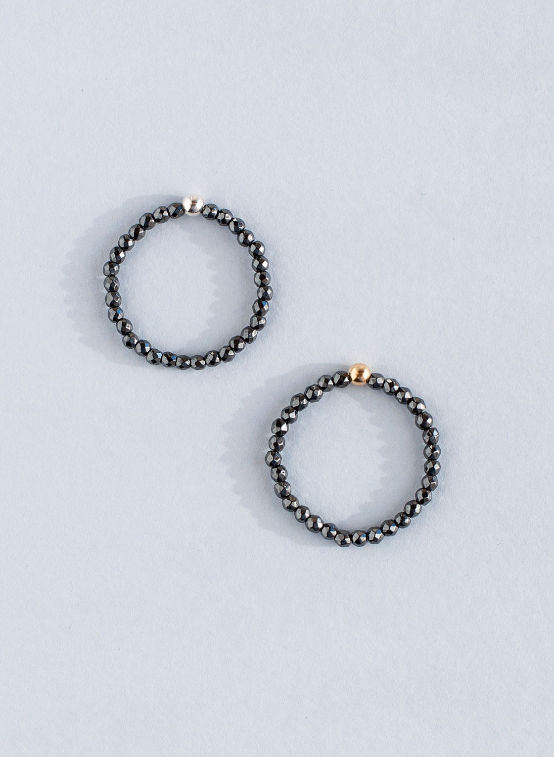 Filigraner Ring mit facettierten Hämatit Kugeln. Ob einzeln getragen als dezentes Statement oder kombiniert mit weiteren Ringen – dieses Schmuckstück setzt elegante Akzente. Der besondere Schliff der Hämatite sorgt für ein edles, feines Funkeln. Dank seines elastischen Designs passt sich der Ring unterschiedlichen Fingergrößen an und bietet dabei einen angenehm bequemen Tragekomfort.